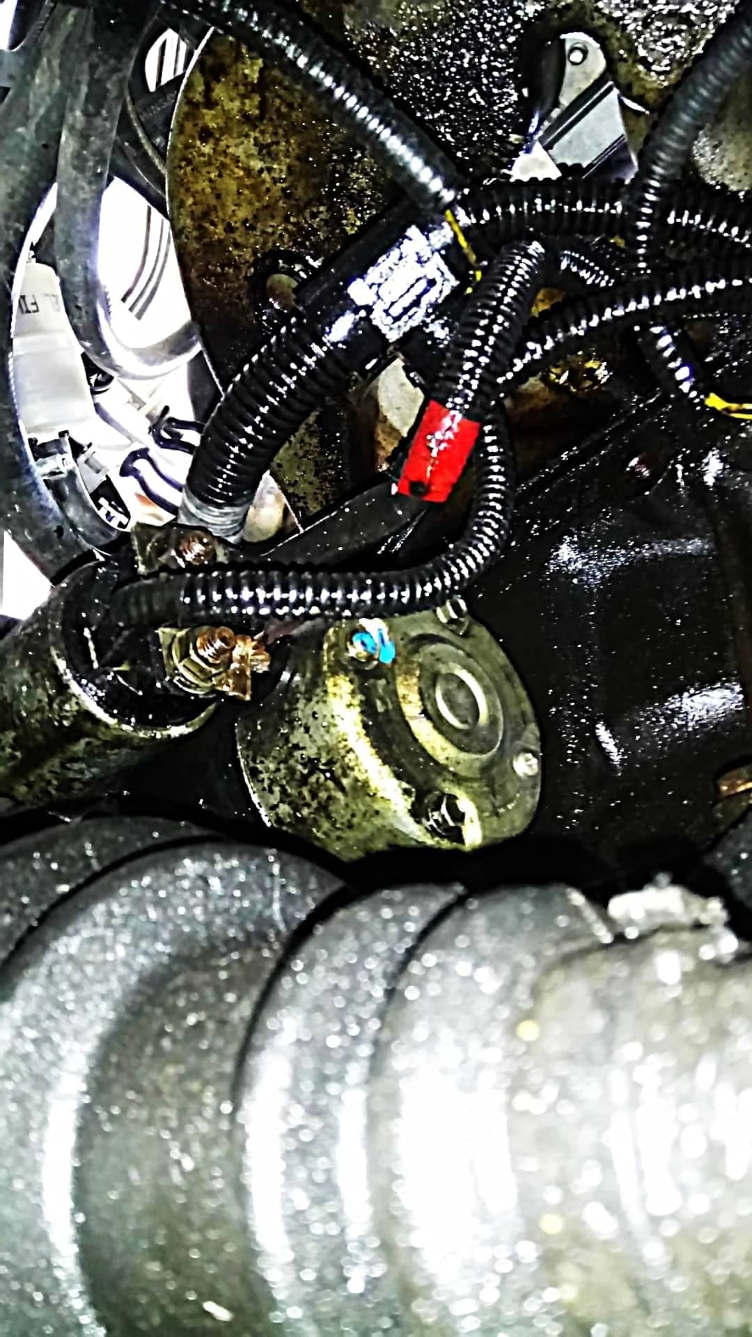 Vue par dessous la voiture, le démarreur est au même niveau que l’alternateur, mais coté conducteur. Il y a 3 câbles électriques : celui qui relie le solénoïde au moteur (il n’est donc pas nécessaire de l’enlever pour le retrait du démarreur), celui qui relie le solénoïde au pôle positif de la batterie (écrou de 13) et celui qui relie le solénoïde au neiman (pas d’écrou pour celui-ci, c’est une cosse).