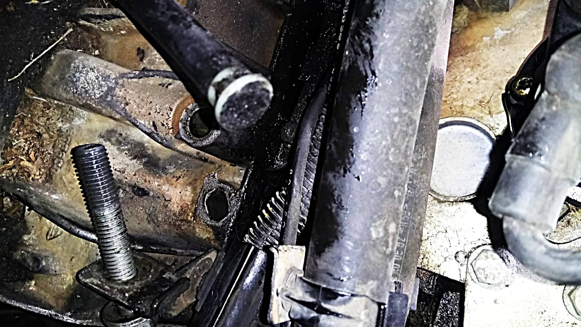 Il y a 3 longues vis dont la tête (taille 16) se trouve soit coté démarreur, soit coté moteur, selon les modèle. Ici, 2 sont coté moteur et la 3ème coté démarreur.